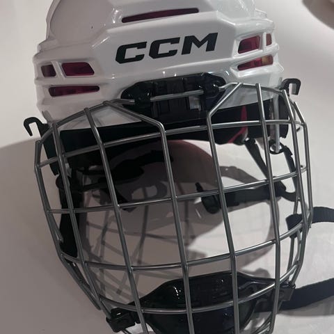 Myydään uudenveroinen valkoinen kerran käytetty CCM jääkiekko kypärä suoja ristikolla. Kypärässä ei ole minkäänlaisia käytön jälkiä ja on uutta vastaavassa kunnossa. Kaikki tarratkin vielä kiinni. Tästä harraste jääkiekkoon tai nuorelle pelaajalle kova kypärä. M koko eli noin 56-60cm