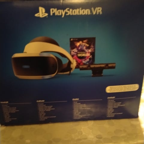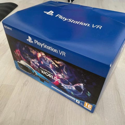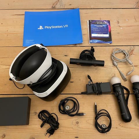 Sony PlayStation VR virtuaalitodellisuuslaite musta väri, sisältää virtalähteen ja kaksi ohjainta. Laite on suunniteltu käytettäväksi PlayStation-pelikonsolin kanssa virtuaalitodellisuuskokemusten luomiseen.