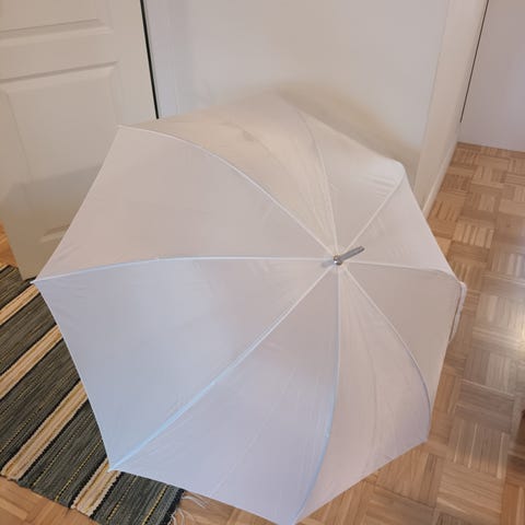 Käyttämätön sateenvarjo häihin. Sateisella tai lumisella säällä saa upean apuvälineen hääkuviin tai juhlapaikalle asteluun.