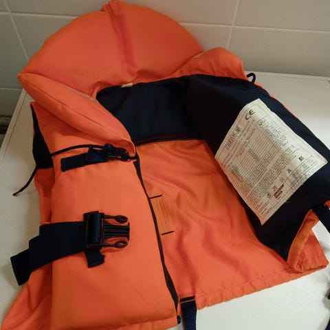 Oranssi pelastusliivi, koko M, varustettu vetoketjulla ja vyöllä. Soveltuu veden läheisyydessä käytettäväksi turvallisuusvälineenä.