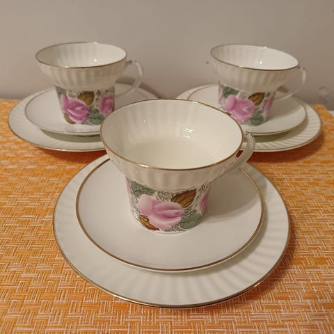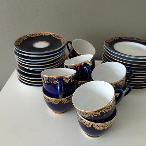 6 kuppia, tassit, leivoslautaset, sokerikko, kermakko, kahvikannu ja hedelmävati.