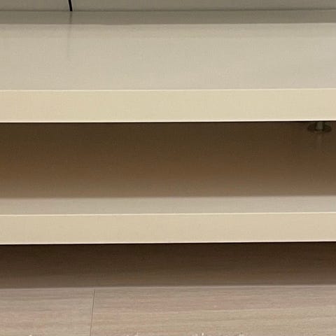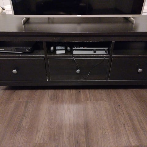 Ikeasta ostettu tv-taso jonka saa ruuvattua seinään kiinni. On tuunattu harmaaksi sävytetyillä laudoilla, joka vain tason päällä.