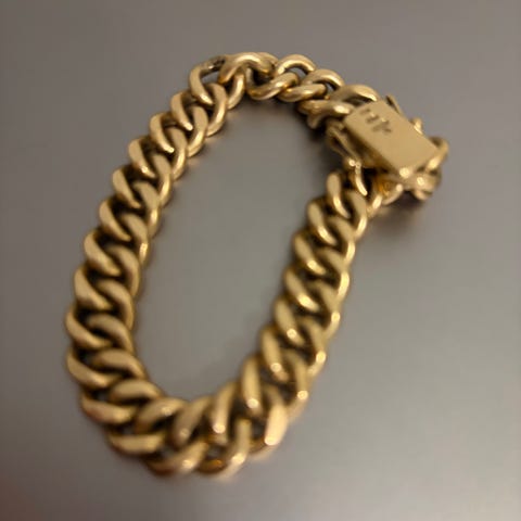 18 karaattin ranneketju,pituus 17,5 ja paksuus noin 4 mm.Paino 8,2 gr. Vain nouto