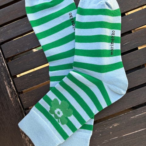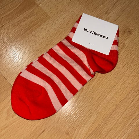 Hyväkuntoiset, jonkin verran käytetyt Marimekko-sukat, oranssi-siniset. Koko noin 37-39. Paljon muuta vaatetta myynnissä myös.