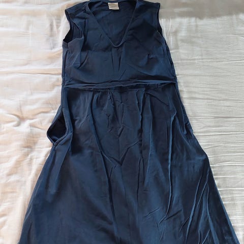 Juhliin sopiva mekko. Kuminauhavyötärö ja alaosan rypytys antavat tilaa vauvamahalle, mutta istuvat nätisti ilmankin. Yläosan "röyhelön" takana kankaassa kaksi pystyhalkiota ja niiden alla trikoinen toppi, jonka slta voi imettää. Ei vaaraa vilahtelusta ja tosi yksityisesti pystyy imettämään.