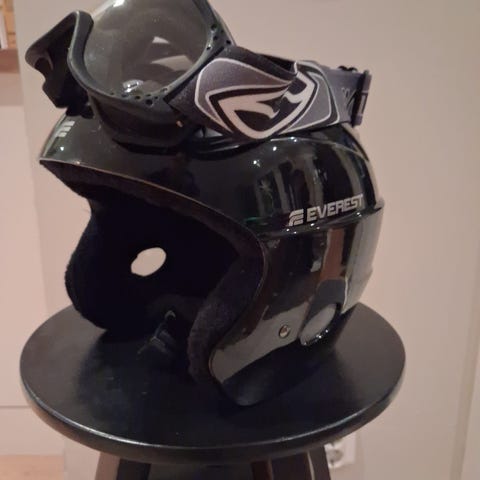 Lasten pienellä käytöllä olleet kypärä ja lasit lasketteluun tai lautailuun.