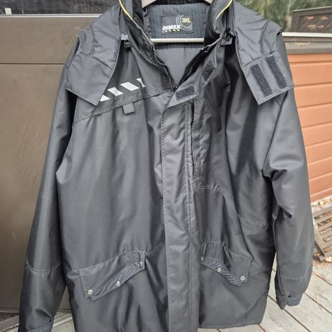 Musta kuoritakki heijasitimilla ja tikkivuorella, pati kertaa käytetty. Sopii parhaiten syys-,ja kevätkeleille veden ja tuulenpitävyyden ansiosta, talvella ei kovinkaan lämmin ja menee vähän kovakuoriseksi mutta voi toki käyttää talvellakin jos ei jäykkyys haittaa. Koko vastaa ehkä enemmänkin 2XL:ää siitä syystä että tämä ei jousta yhtään