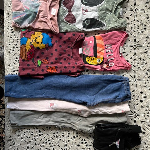 Vaatepaketti tytölle koossa 98. Kaikki siistejä käytettyjä vaatteita ja ovat olleet jokapäiväisessä käytössä 98 kokoa käyttävällä lapsella.