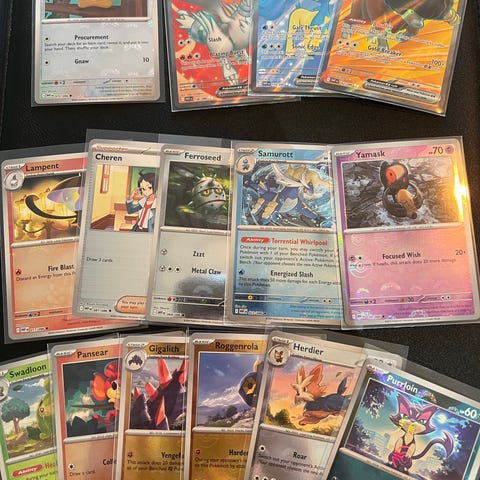Iso kasa white flare setin kortteja. Kaksi vasenta pinoa lajittelematta, eli holot, bulk ja reverset kaikki samassa. Keskimmäinen pino vain reverset, pienin pino vain pokeball kortit, ja black bolt boksissa normi kortit. Mukaan tottakai edessä olevat energy holo, kolme masterball korttii ja näkyvät ex kortit.