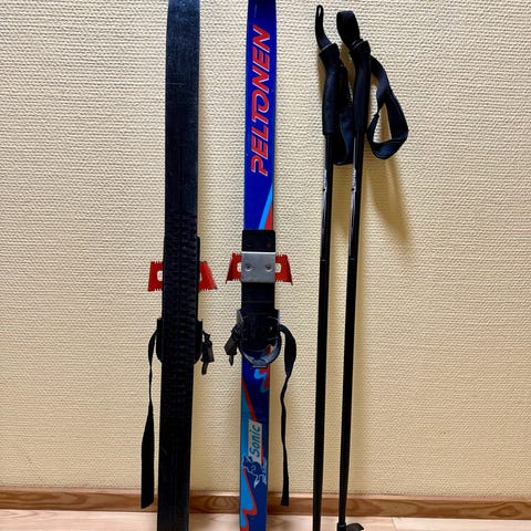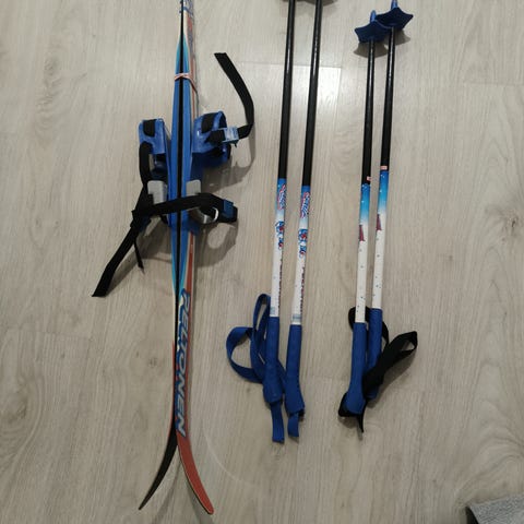 Uudet lasten ensisukset 100 cm ja sauvat 80 cm. Voiteluvapaa pitopohja. Suksien kiinnitys kenkiin.