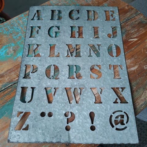 Myydään mustat metallisapluunat, kirjaimet ja numerot. Pienempi 19,5 x 19,5 cm. Isompi 27 x 19,5 cm. Naarmuja metallissa. Hinta molemmista.