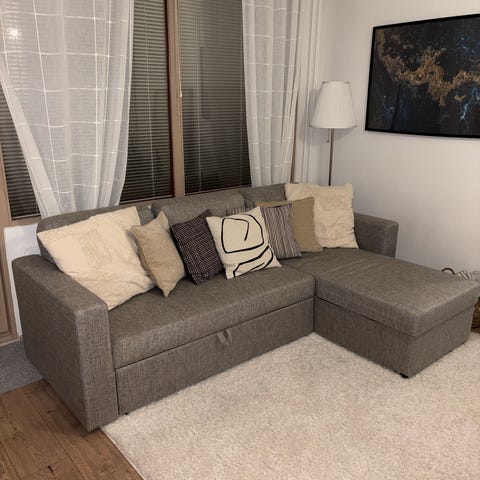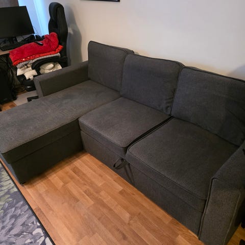 Divaanivuodesohva, joka on ollut käytössä vajaan 5 vuoden ajan. Toinen käsinoja kankaan alta vaurioitunut (näkyy kuvassa), mutta muuten hyvässä kunnossa.