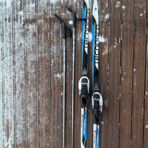 Paketti lapselle murtomaahiihtoon. Mukaan suksipidikkeet. Side NNN. Sauvat 100cm.