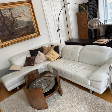 Kulmasohvan mitat 306 ja 236. Painaa paljon. Käytetty, yleisilme siisti.