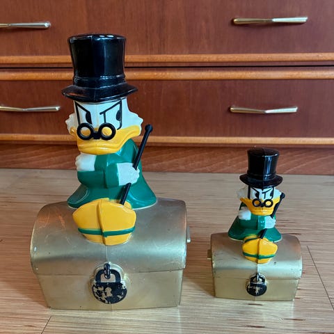 Roope ankan kävelykeppi pieneen säästöpossun (korkeus 15cm)