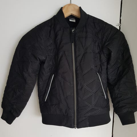 Polarn o pyret välikausitakki koko 128. Jonkun verran tummentumaa / kulumaa.