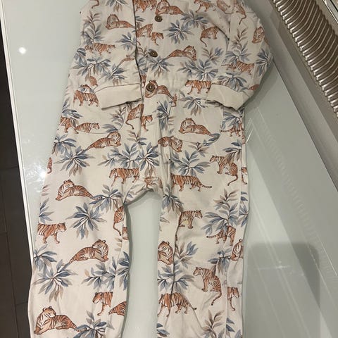 Kaksi Newbien yöpukua. Ostettu uutena, ollut yhdellä käytössä. Beige nalleyökkäri hyvä käytetty kunto, vaaleansininen tiikeriyökkäri muuten hyvä käytetty kunto MUTTA housuissa takana Newbien tikatun lapun vieressä pieni reikä (en ole huomannut käytössä, nyt kuvatessa huomattu).
