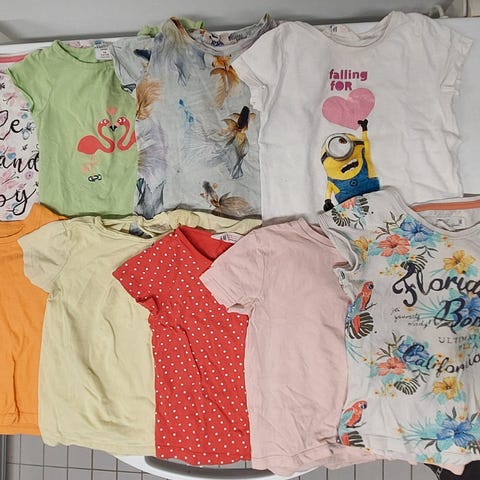 Hihattomat t-paidat settinä. Hello kittyn printissä kulumaa, ja sen alapuolella näkyvässä paidassa pieni värjäymä. Muuten siistejä.