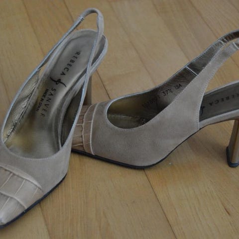 Kauniit nahkapistokkaat, joissa pieni kanta. Tyylikkäät leikkaukset ja valkoiset tehostetikkaukset. Kokomerkintää 4 ½, eli vastaa kokoa 37,5.
