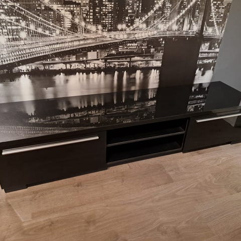 Myydään muuton alta Jyskistä ostettu tv-taso. Hyvässä kunnossa pois lukien yksi pieni halkeama liukukaapin kohdalla (kts kuva). Mustan liukuoven takana hyllytilaa. Nouto Hämeenpuistosta Tampereelta ja maksu Mobilepaylla.