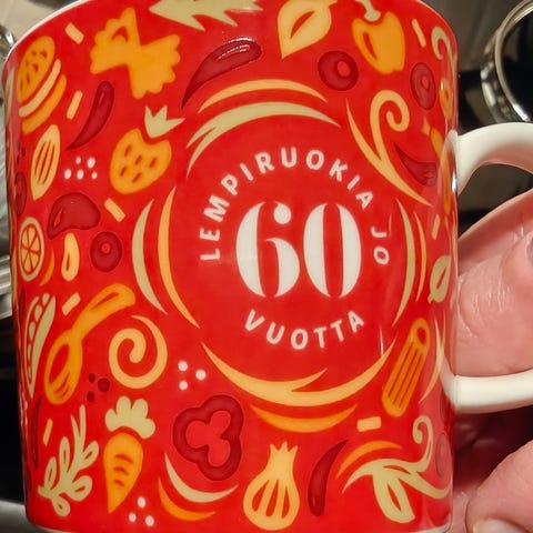 Arabia käsinmaalattu muki, jossa kukkakuvio ja teksti. Valmistettu Suomessa, posliinimateriaalia.tarjoa