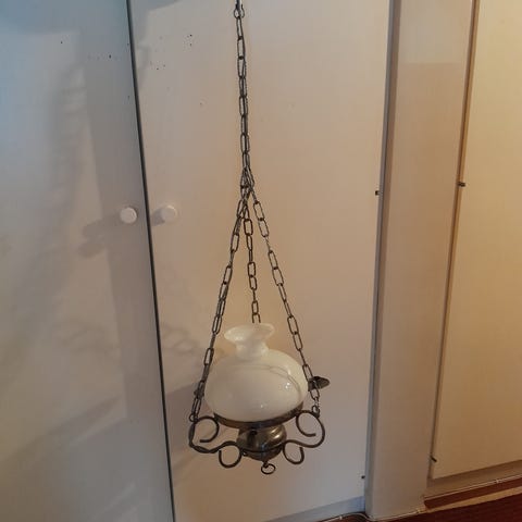 Beautiful minimalistic pendant metal lamp with metal lampshade and frosted glass ball in a perfect condition as a new item. Adjustable cord with fabric braiding, metal base, E27 lamp holder. Lamp and plug not included. Total length 37 cm, diameter 36.5 cm. Cord length 130 cm. Weight approx. 3 kg. OVH 80€.