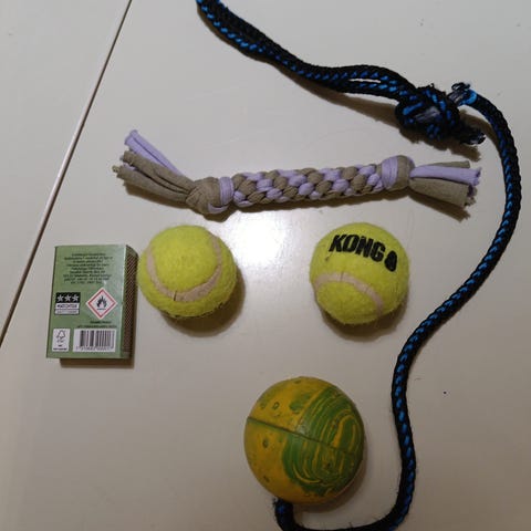 Meillä hankittiin isot määrät pennulle mutta isompien koirien takia ei uskallettu pitääkkään pikkuleluja käytössä ettei päädy kenenkään nieluun ja siksi vain muutama oli pennulla muutaman kerran kun leikki itsekseen
