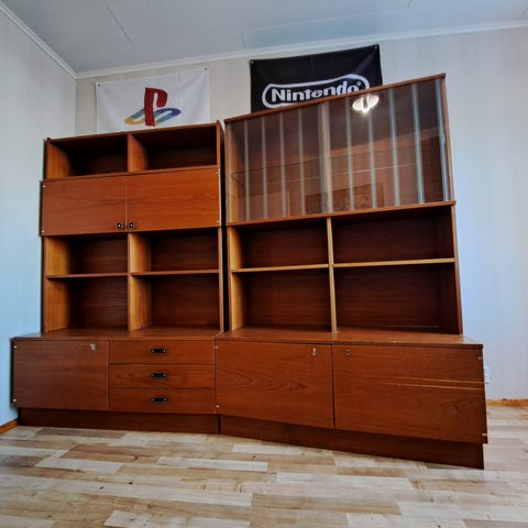 1960-70-luvun teakki(?) kirjahylly, missä on Tv-taso keskellä. Käytetty mutta hyvässä kunnossa. Kaappeja, laatikoita, hyllyjä plus lasiovi kaappi vasemmalla.