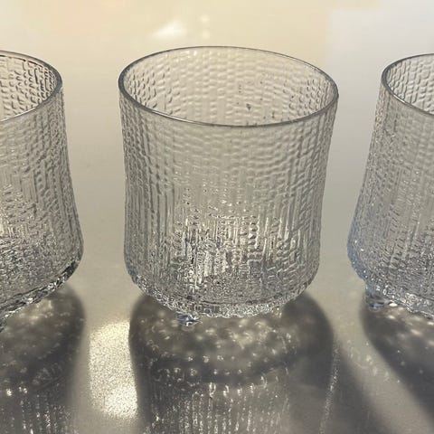 Iittala Ultima Thule -sarjan juomalasit, kirkas lasi. Setti sisältää neljä lasia, joissa on tunnusomainen kohokuvioitu pinta. Lasit soveltuvat juomien tarjoiluun ja ovat valmistettu kestävästä lasimateriaalista.