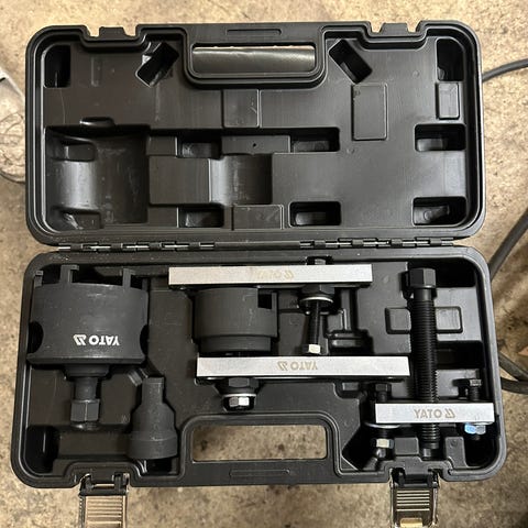 Pääaksiloiden välisen stefan vaihtoon tarkoitetut työkalut. Ulosvetäjä sekä uuden tiivisteen asennukseen työkalu. Kerran käytetty ja todettu toimivaksi.