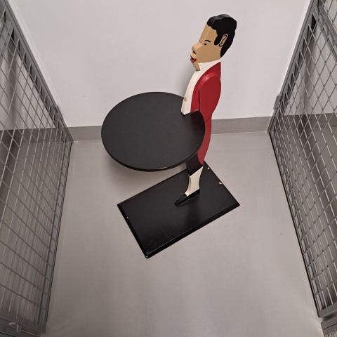 Tällä patsaalla on useita nimiä. Hiljainen palvelija, Silent server, Dumb waiter. Tämä yksilö on ainutlaatuinen ja hienosti tehty. En ole nähnyt vastaavia. Ikäisekseen hyvässä kunnossa. Myydään tarjousten perusteella.