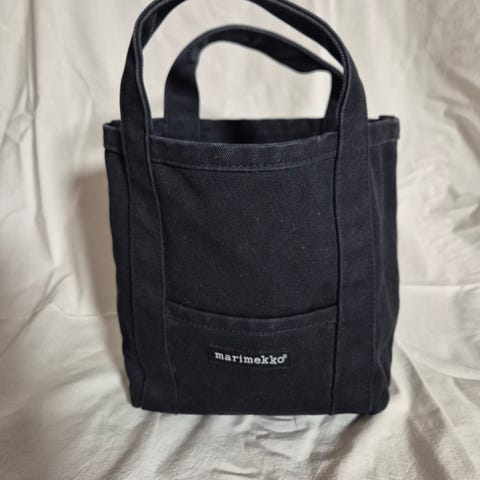 Myydään uusi Marimekko Mini Peruskassi -käsilaukku. Laukku on valmistettu paksusta ja kestävästä mustasta puuvillamarkiisista. Siinä on kaksi tukevaa kantokahvaa, edessä pieni tasku sekä lisäkahva laukun takapuolella.