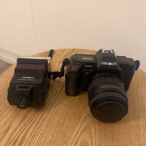 Vanha Minoltan järjestelmäkamera 1960-luvun alkupuolelta. Kamerassa paljon käytön jälkiä ja kulumaa. Suljin toimiva kaikilla nopeuksilla.