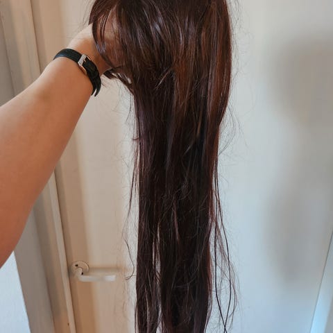 Pitkä Ruskea Synteettinen Peruukki, joka on krepattu ja vähän kerrostettu jotta hiukset nättäisiltä enemmän aidolta