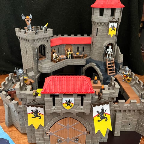 Playmobil linnoitussaari, 3 ritaria, hevonen, aseet, aarteita ja varusteita. Ritarisetti on hyvässä kunnossa, mutta joitakin pieniä osia puuttuu