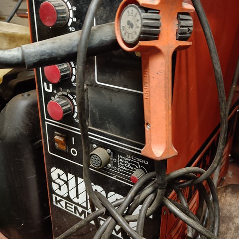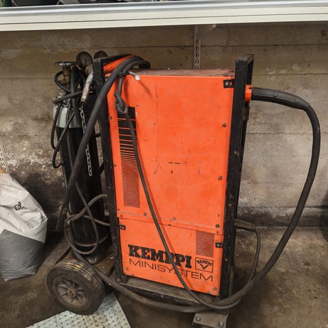 Toimiva Wallius i1800 Mig. Mukaan Mig-hitsauspolttimen ja maadoituksen lisäksi puikkohitsauskaapelit.