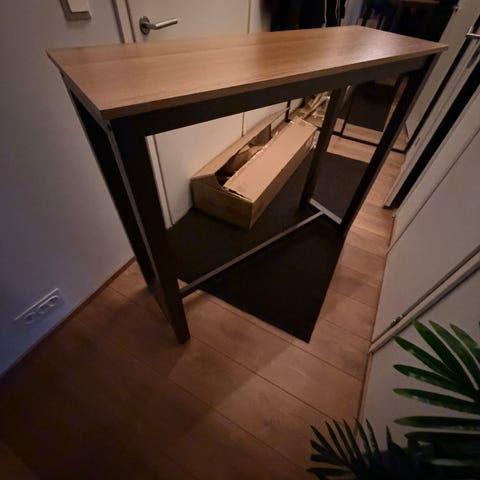Siisti, hyvässä kunnossa oleva korkea pöytä ja neljä tuolia. Pöydässä pieni tahra mutta ei haittaa käyttöä näkyy vikassa kuvassa, itsellä ollut pöytäliina jolla sen saa peittymään nätisti.