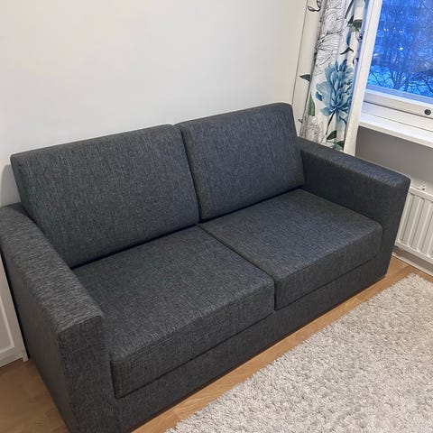 Tästä käytännöllinen vuodesohva vaikkapa vierashuoneen nurkkaan! Runko on saanut edellisen omistajan aikana siipeensä, kun joku on istunut levitettynä olleen käsinojan päälle. Sohva on sen jälkeen purettu atomeiksi ja korjattu vähintäänkin yhtä kestäväksi kuin alkuperäinen. Samalla patja päivitettiin Porin Villa ja Peitteen luonnonkumipatjaan.