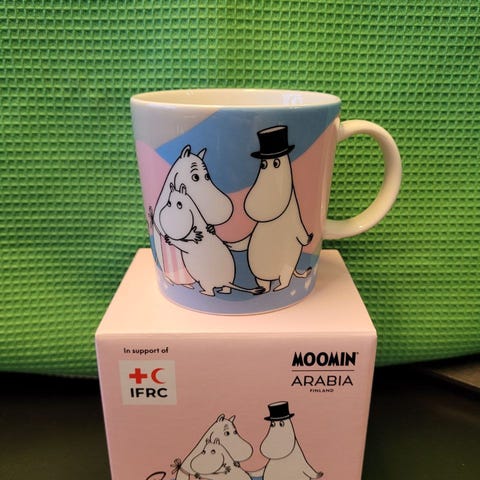 Uusi Japanista ostettu muumi muki, omassa laatikossa. Nouto Martinlaaksosta