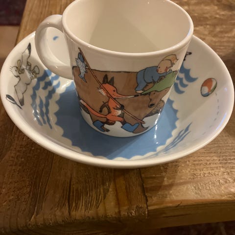 Arabia muki ja lautanen, joissa on värikäs kuvitus. Mukissa on lapsiaiheinen kuva, jossa lapsi keinuu ja kettu, lautasessa on kuva karhusta ja lapsista piknikillä. Astiat ovat posliinia ja sopivat arkiseen käyttöön. Voi jotakin käytön jälkeä näkyä.