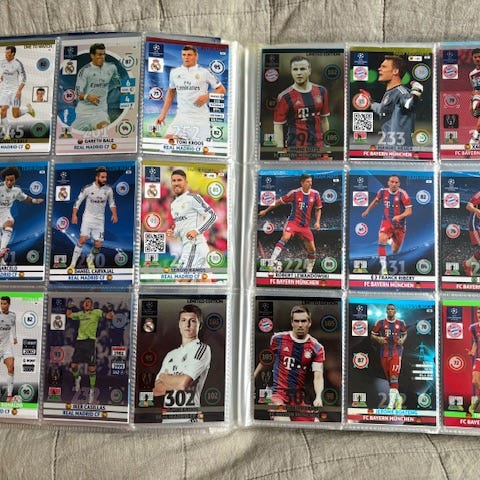 UEFA Champions League jalkapallokortit sisältävät eri joukkueiden pelaajia ja ovat keräilykortteja. Kortit esittävät pelaajien kuvia, nimiä ja tilastotietoja, kuten hyökkäys-, puolustus- ja taitopisteitä.