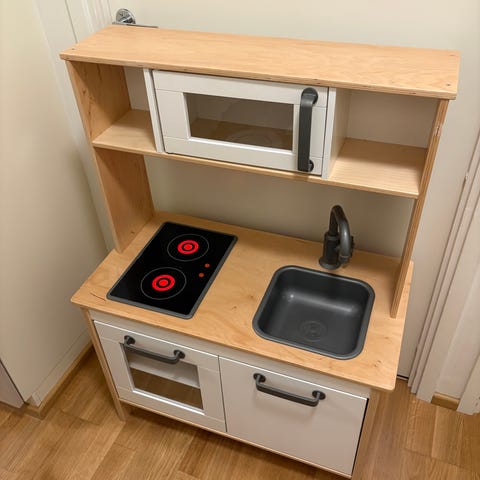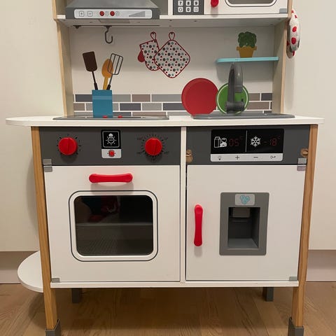 Käytetty leikkikeittiö. Muuten tosi hyvässä kunnossa mutta yläkaapin lasi on hieman naarmuinen. Uudet patterit lieden valoissa. Mukaan tulee ruokailuvälineitä, astioita ja leikkisyötäviä.