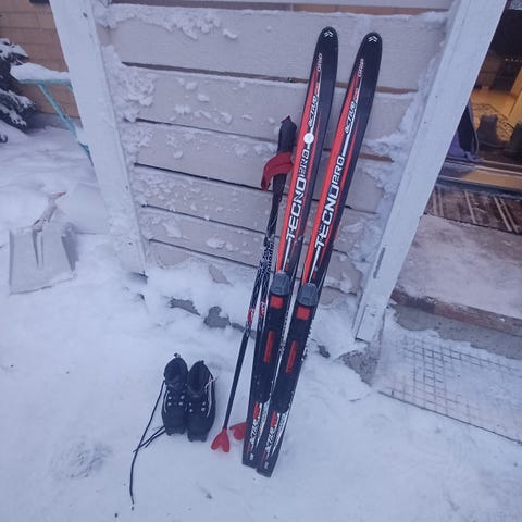 Lasten suksipaketti. Sukset,sauvat ja monot. Sukset 110cm. Monot 28.