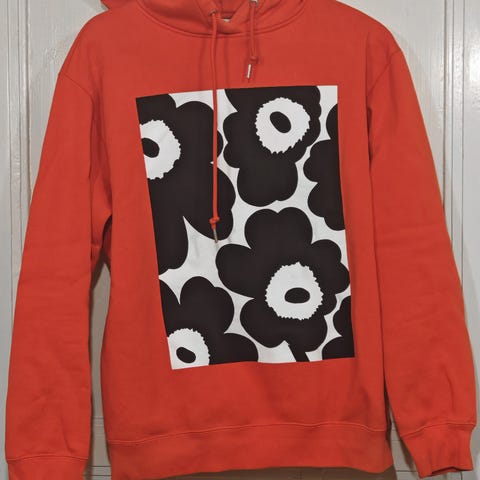 Marimekko musta Runoja huppari valkoisella unikko kuviolla. Koko Xl. Käytetty muutaman kerran. Ei olekaan itselle mieluinen.