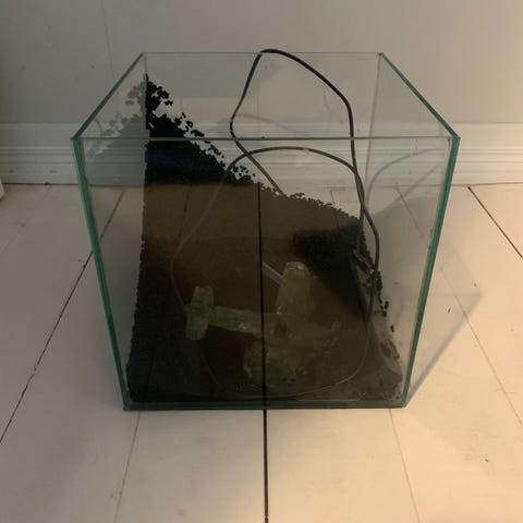 Pieni akvaario. Ehjä ei vuoda. Lamppu + lähes uusi suodatin pumppu + jokunen koriste. K 35cm x S 25cm x 50cm