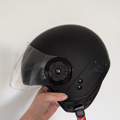 Origine merkkinen avokypärä visiirillä sekä aurinkoisella kelillä mukavalla aurinkolipalla, jonka saa napista silmille ja pois. Kypärää on pari kesää käytetty skootteriajeluilla. Mukaan näppärä säilytys-/kantopussi. Koko epävarma, aikuisen käytöstä, muistaakseni M tai L.