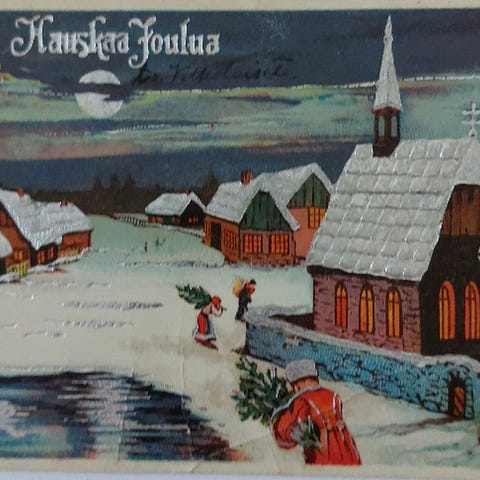 Kello löi jo viisi, lapset herätkää! Näin lähdettiin joulukirkkoon ennen vanhaan maaseudulla. Tässä on nippu postikortteja kirkkomatkoista. Kortit maksavat euron kappale. Hinnan edullisuudesta huolimatta joukkoon mahtuu aarteita.