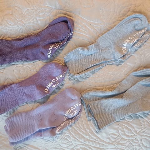 2 paria tummansinisiä ja 3 paria harmaita Polarn o pyret sukkia. Nämä pysyvät hyvin jalassa ja sopivat hyvin kenkiin, koska ei ole jarruja. Tummansinisissä on pienen pientä haalistumaa ja pienen pientä nukkaa. Muuten kaikki sukat on hyväkuntoisia. Nouto Tammistosta Vantaalta tai toimitus ainoastaan toridiilinä.
