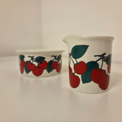Alkuperäistä Arabian Krokus-sarjaa kermakko ja sokerikko, värikkäät. Kermakon kunto kuin uusi, sokerikon hyvä (pientä kulumaa pohjan reunuksessa).