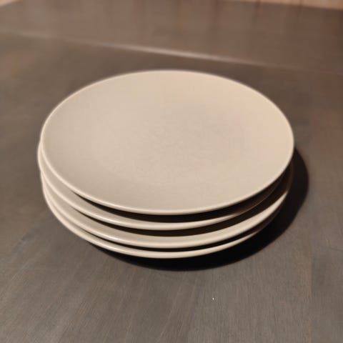 Tarjoilulautanen, kolme muuta lautasta, lasikulho, uunivuoka, juomapullo, muovirasioita, lasten lautanen, kahvirasia ja kori.